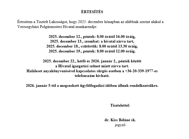 Decemberi munkarend a Veresegyházi Polgármesteri Hivatalban