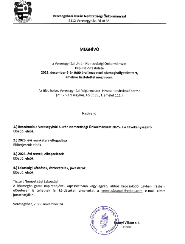 Veresegyházi Ukrán Nemzetiségi Önkormányzat Képviselő-testülete 2025. december 9-én, kedden 9:00 órai kezdettel közmeghallgatást tart. Az ülés helye: a Polgármesteri Hivatal tanácskozó terme (I. emelet 111.)